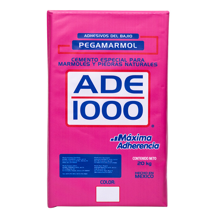 Pegamármol ADE1000, es un adhesivo elaborado a base de cemento portland y modificado con resinas y arenas de alta resistencia, diseñado para productos de media y alta absorción de humedad. Cumplimiento de los requerimientos de calidad de acuerdo a la norma NMX-C-420-1